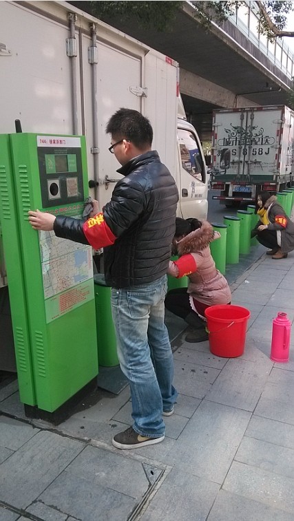 連日的陰雨天氣,使得公共自行車上沾滿了泥濘和污漬,社區(qū)組織志愿者為周邊的公共自行車進行擦洗,帶上提早準備好的水桶和抹布,用自己的實際行動對每一輛公共自行車進行了擦洗。認真,是每位志愿者的態(tài)度;細致,是每位志愿者的作風。志愿者們不但為每一輛車子進行了擦洗,還向過往的行人提倡“綠色出行”的環(huán)保理念。