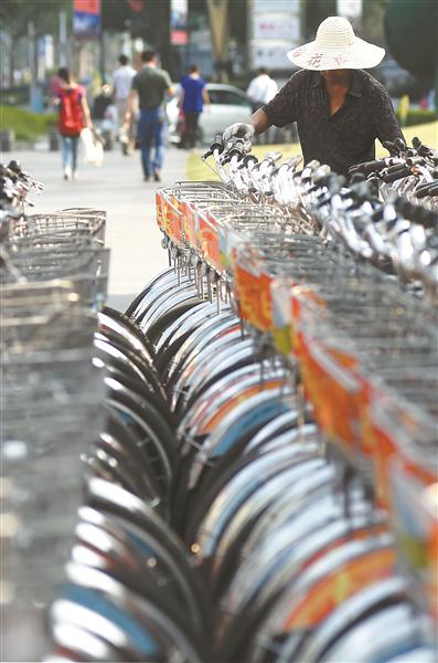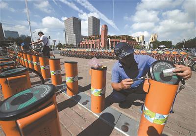 9月10日17點,南京興隆大街地鐵站公共自行車管理員老匡和老戴迎來了一天最忙碌的時候,他倆在空樁和轉(zhuǎn)運車之間來回穿梭,不一會兒就滿身大汗。與此同時,轉(zhuǎn)運車奔波于各站點之間,根據(jù)流量調(diào)整車輛配置。