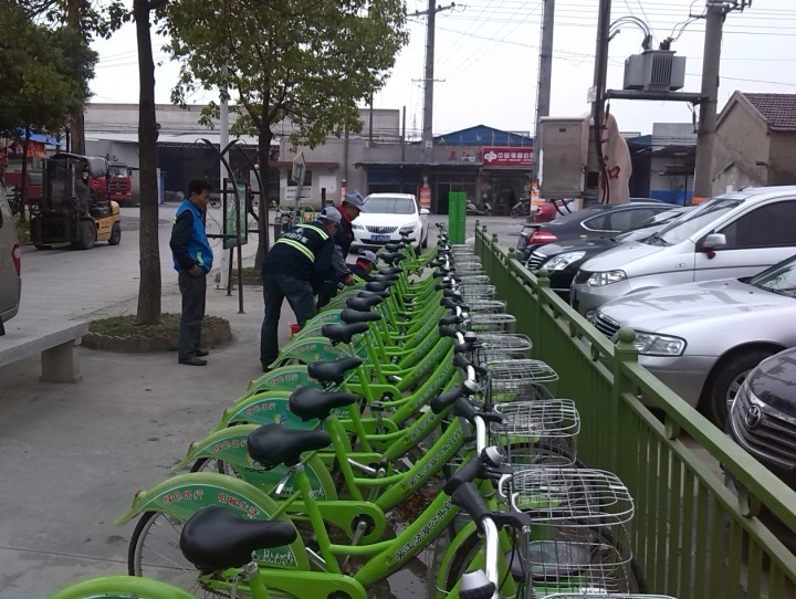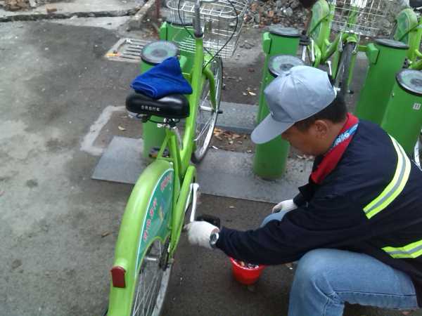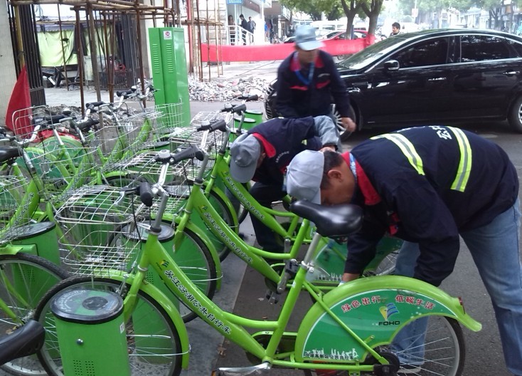 多輛公共自行車進行檢查、維修等養(yǎng)護作業(yè),確保市民騎行安全。