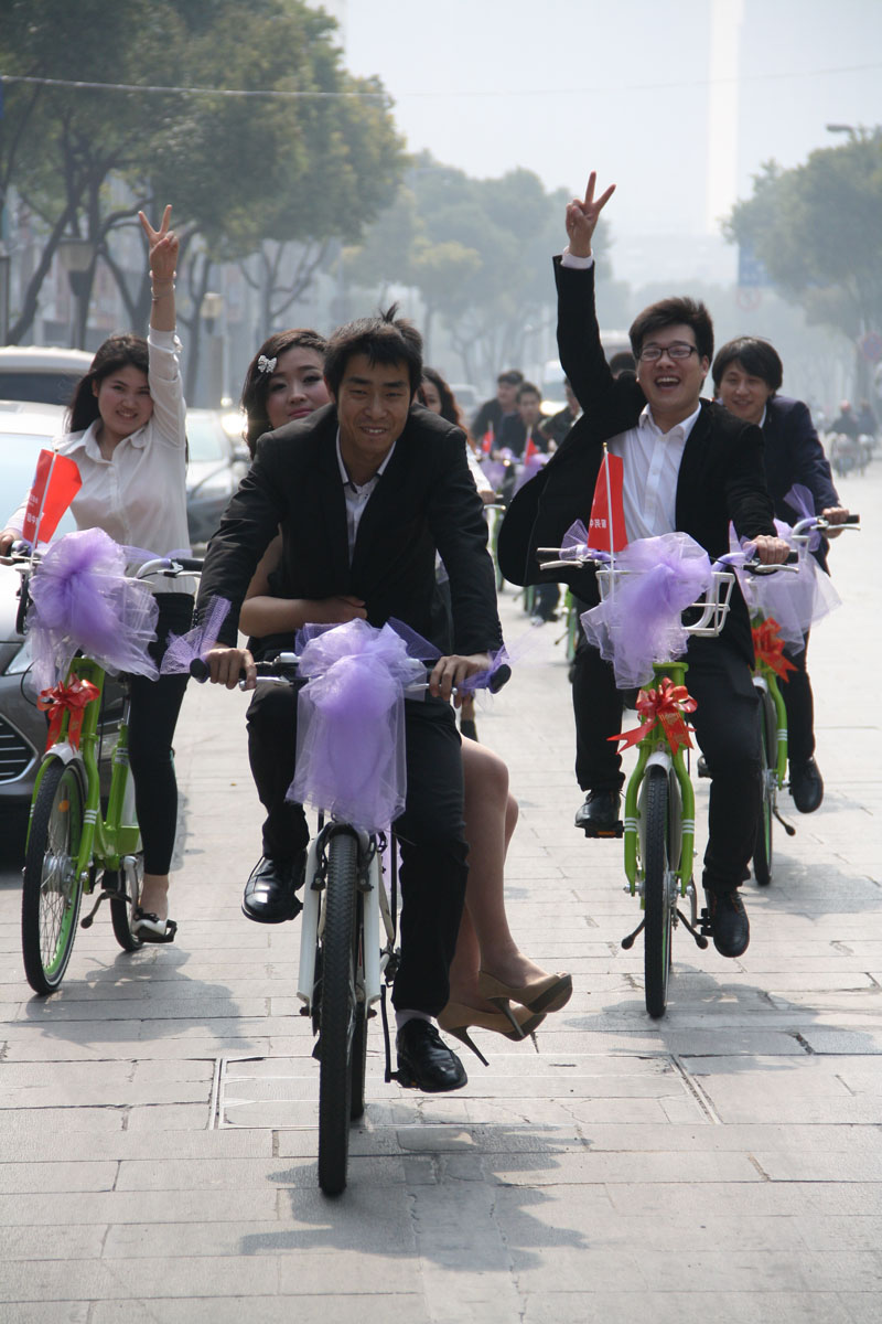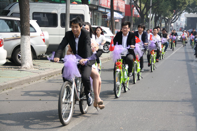 劉川想到,新北區(qū)的街頭有不少草綠色的公共自行車,特別好看,“這一溜統(tǒng)一顏色的婚車,場(chǎng)面就有氣勢(shì)了!”于是劉川嘗試著聯(lián)系常州永安公共自行車公司,將自己的想法跟對(duì)方企業(yè)負(fù)責(zé)人一交流,對(duì)方很爽快地同意提供20輛嶄新的自行車。