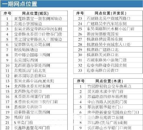 序號 網(wǎng)點位置(城區(qū))1夏蓮路嘉寶一期東側圍墻邊2蘇苑小學圍墻邊3東吳北路寶帶路口華潤東側4寶帶路水香街口什物谷門前5美之國寶帶路出入口圍墻邊6寶帶路供電公司東側7財政局圍墻邊8吳中路公園路口西側9東吳國際西側10龍西街道辦事處西側11蘇苑飯店門前北側12新蘇國際縣前街口13東吳北路中遠商廈北側14龍西路水香五村東側15龍西路先奇街口16水香街蘇州銀行門前17水香街長興街口農(nóng)行門前18縣前街月浜街口19迎春路嘉寶三期西側20殘聯(lián)門前21 s半島門前22長蠡路蠡墅花園門前