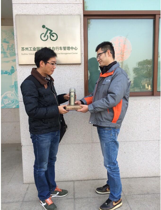 2014年12月23日,我們巡檢師傅進行日常工作的時候在車籃里發(fā)現(xiàn)了一個保溫杯和一個盒子。雖然物品不是很貴重,但是師傅在撿到的第一時間便聯(lián)系了我們客服人員,將撿到的物品交至公共自行車管理中心暫為保管。2014年12月29日,拾檢到的物品已被失主的朋友代為領(lǐng)取。