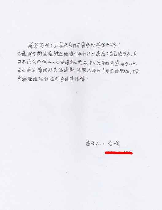 失主認領(lǐng)后非常感動隨及拿出一部分作為酬謝,被茆師傅和李師傅婉言拒絕!失主非常感動,他說:“我是從北京到蘇州旅游的。今天在園區(qū)金雞湖附近游玩不慎將包遺忘了。本以為找不到了,沒想到不超過2小時你們就聯(lián)系到我了,非常感謝你們。蘇州園林真美、蘇州市民的素質(zhì)真高!”