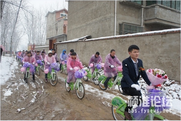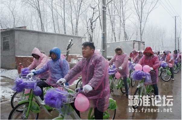 30輛公共自行車整齊碼開,時云濤“打頭陣”騎在最前面,后面時云濤的親朋好友們,四人一排,整齊劃一。因為一直在下大雪,新郎的家人還特別貼心的為騎自行車的人們準(zhǔn)備了防寒的手套和粉色的雨衣,穿著小粉,騎著小綠,浩浩蕩蕩去新娘家迎親去,一支騎著公共自行車的婚車隊伍“招搖過街”也是賺足了回頭率,有不少路人駐足觀看,沿街接受路人的祝福,再配上這漫天大雪,簡直太浪漫了。新娘閆瑞金告訴記者:“時云濤平時在生活中就是一個非常浪漫的人,兩人在談戀愛時就經(jīng)常會想出許多有創(chuàng)意的點子我開心,這次用公共自行車來迎親也是讓我非常意外,而且也非常有紀(jì)念意義,我相信這個婚禮會讓我終身難忘。外面一直在下雪,我也非常感動,他也和迎親隊伍一路騎車過來,相信我們以后一定會幸福到永遠(yuǎn)?!?/p>