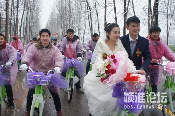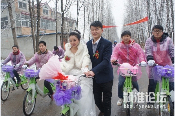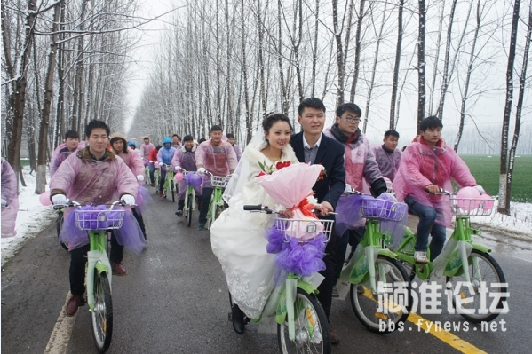 時云濤是一名年輕的90后,在阜陽臨沂商城從事門業(yè)生意。新娘名叫閆瑞金,是行流鎮(zhèn)高橋村人,新娘和新郎是高中同學(xué),兩人戀愛至今已經(jīng)走過了四五個年頭,大學(xué)期間兩人分隔兩地,新郎時云濤在大一時退學(xué)回家創(chuàng)業(yè),自主創(chuàng)業(yè)生意也是越來越紅火,事業(yè)有成接下來就要抱得美人歸了,結(jié)婚無疑是一件人生大事,這結(jié)婚就是要結(jié)的與眾不同,什么樣的結(jié)婚形式才能更別出心裁呢,時云濤在采辦結(jié)婚用品的時候,碰巧看見了停放在臨沂商城附近的公共自行車,時云濤就想如果用公共自行車當(dāng)婚車,不僅節(jié)能環(huán)保,而且整齊劃一,想想那齊刷刷排整齊的自行車迎親隊伍,效果應(yīng)該是不一般的吸引眼球吧,于是這個創(chuàng)意婚禮的念頭就這樣應(yīng)運而生。