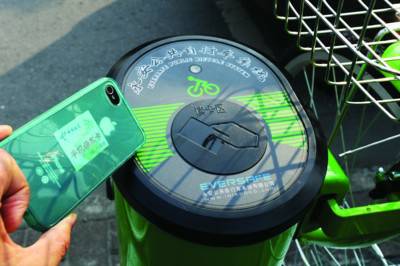 這張比郵票稍大的標貼卡可貼在手機上、皮夾里,使用時只需在公共自行車站點照一照就可以完成借、還車。