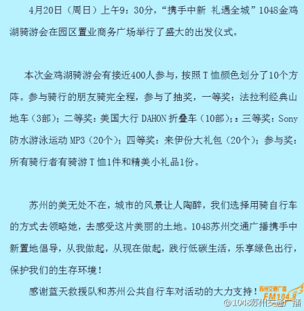 4月20日(周日)上午9:30分,“攜手中新 禮遇全城”1048金雞湖騎游會(huì)在園區(qū)置業(yè)商務(wù)廣場(chǎng)舉行了盛大的出發(fā)儀式。1048攜手中新置地倡導(dǎo),從我做起,踐行低碳生活,樂享綠色出行,保護(hù)我們的生存環(huán)境!感謝蘇州公共自行車對(duì)活動(dòng)的大力支持!