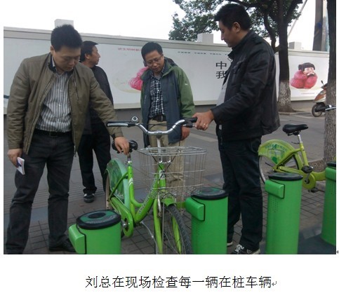 2013年11月16日,蘇州分公司由總經(jīng)理劉冬帶隊(duì),各區(qū)運(yùn)營主管及客服主管參加組成檢查組,放棄周六休息到現(xiàn)場(chǎng)檢查站點(diǎn)狀況(故障車輛在樁、保潔、辦卡點(diǎn)的7s)等工作。