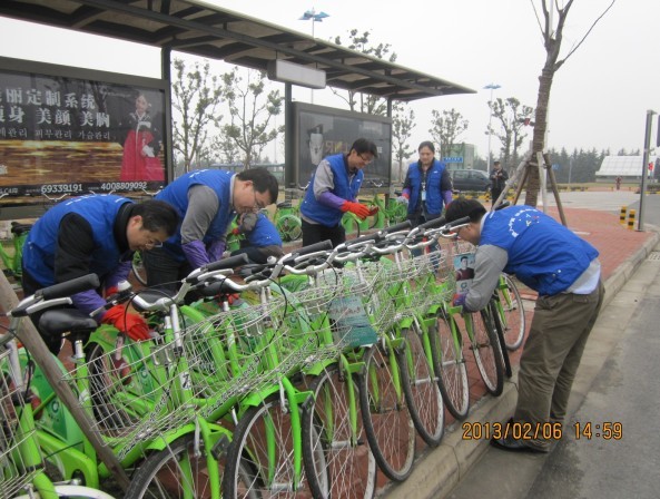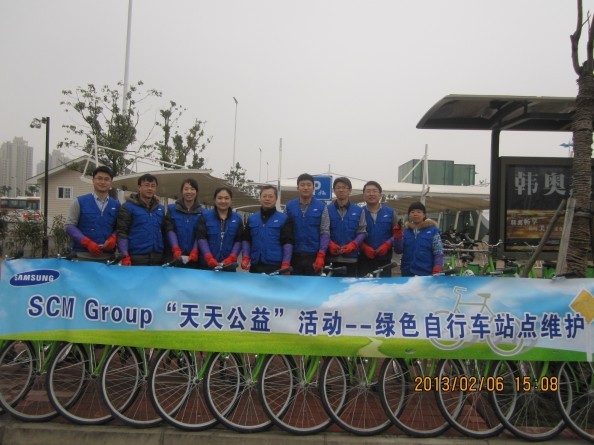 在活動現(xiàn)場有些自行車需要調(diào)整零件的,懂自行車維護的同志就自告奮勇的站出來擔(dān)當(dāng)這個任務(wù),有些自行車需要清潔工作的,就拿起抹布認真仔細地擦試,不一會兒工夫一個又一個站點在他們熟練的動作中形成一道道美麗的風(fēng)景線。三星顯示器有限公司率先從自身做起,將環(huán)保理念深入員工帶動市民,以實際行動支持環(huán)保事業(yè)。