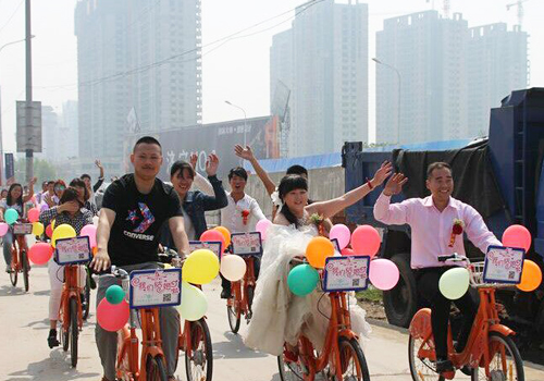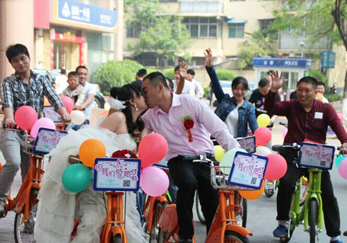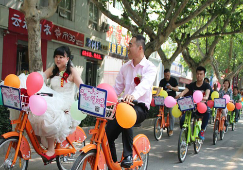城區(qū)內(nèi)現(xiàn)最“亮”婚車(chē)隊(duì)——浪漫與環(huán)保并舉 婚禮當(dāng)日,城區(qū)街頭出現(xiàn)了一片“壯觀”的景象——30人騎著掛滿(mǎn)氣球的公共自行車(chē),組成一排“豪氣”的婚禮車(chē)隊(duì)。在隊(duì)伍最前端“領(lǐng)騎”的是一對(duì)新人,新娘身著一襲潔白婚紗、人群中顯得清新亮麗,新郎身著筆挺的西裝,打著領(lǐng)帶,胸前佩戴著鮮艷的胸花,英俊帥氣?! ∵@支公共自行車(chē)迎親隊(duì)從古槐路黨校大廈出發(fā),最后到達(dá)西郊宋南村。所到之處無(wú)不吸引市民的駐足觀看,大家一邊報(bào)以贊許的目光和微笑祝福新人,一邊紛紛拿出手機(jī)記錄這與眾不同的時(shí)刻。 “用自行車(chē)當(dāng)婚車(chē),真浪漫啊!這比寶馬、奔馳接新娘子拉風(fēng)多了!”,在古槐路等公交車(chē)的宋先生說(shuō)這是他第一次看到新郎用自行車(chē)接媳婦,和租用豪華轎車(chē)“接親”相比,用自行車(chē)既浪漫又環(huán)保。