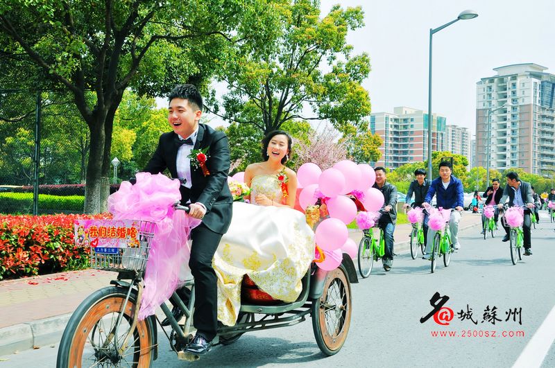 “婚禮,作為人生一項非常重要的階段和儀式,我想讓它更有意義,更有紀念價值。于是便和女朋友商量,策劃了這場綠色婚禮?!笨娤壬f,他和同事們一起,借了二十輛綠色環(huán)保公共自行車,“三輪車就是我們的婚車?!?/p>