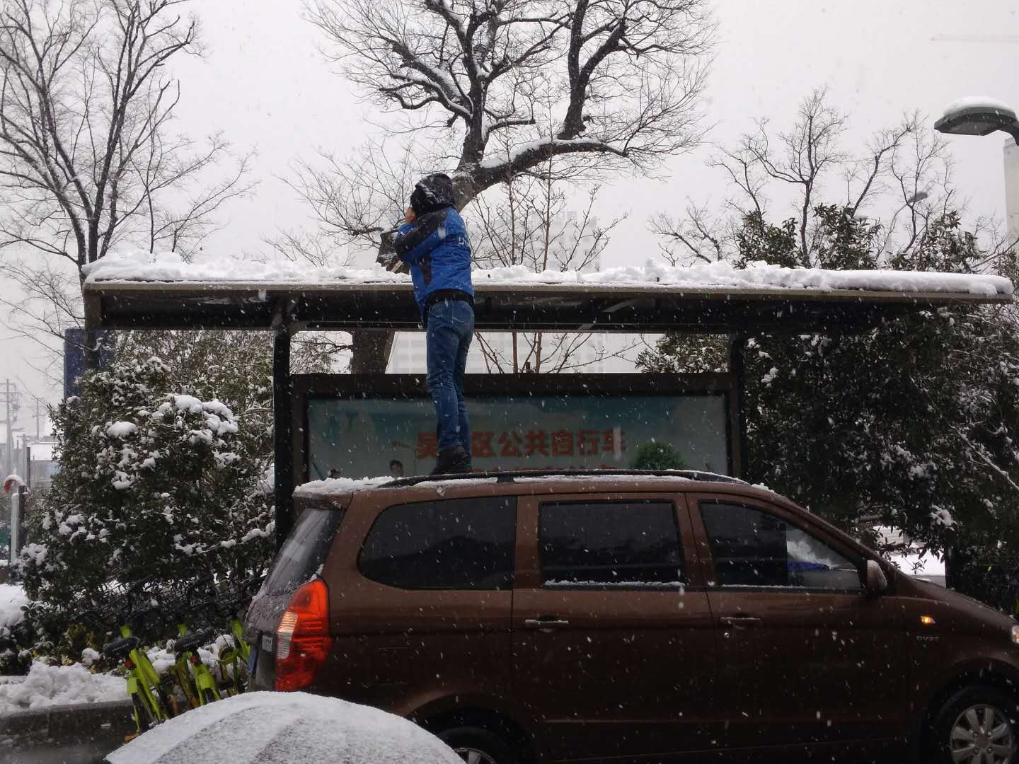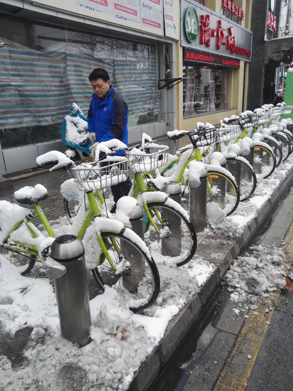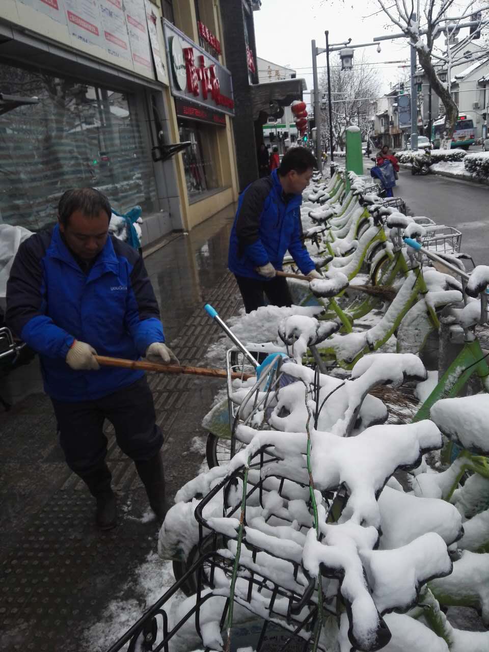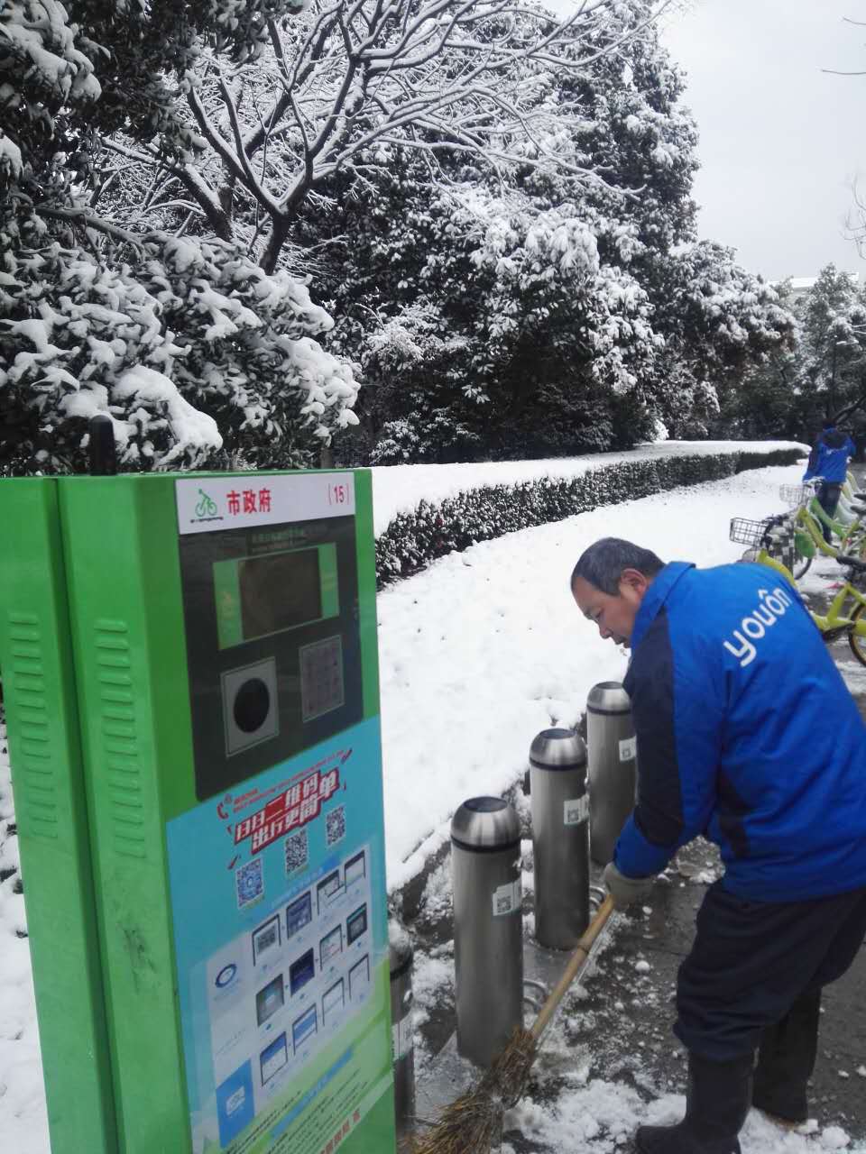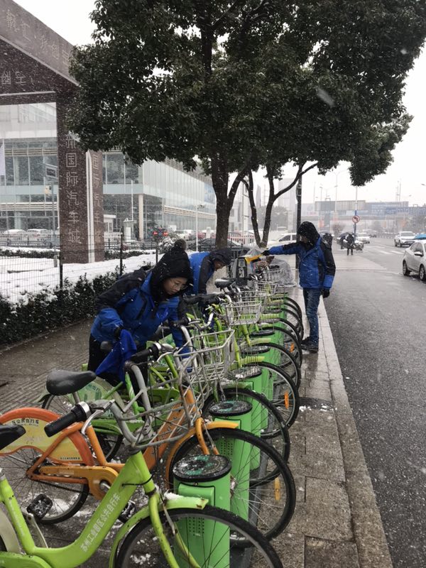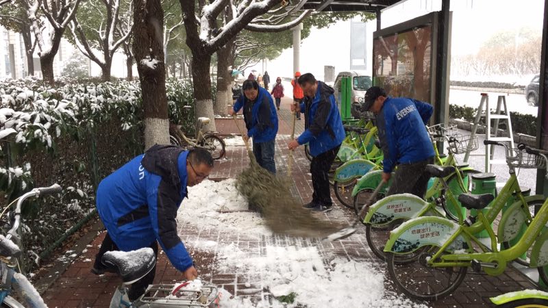 2018年1月25日,蘇州下起了暴雪,斷斷續(xù)續(xù)持續(xù)至28日的清晨。路面上、公共自行車站點上的積雪和地面冰塊給市民的出行帶來了不便。25日中午12點,蘇州公共自行車管理中心發(fā)布了站點停運通知。26日起,永安行蘇州分公司由管理層帶隊,全體工作人員,在公共自行車系統(tǒng)停運期間,早早來到公司奔赴一線清掃積雪、檢查站點樁位、車輛情況。為后期站點開通,保障廣大市民騎行安全,做好準備工作。