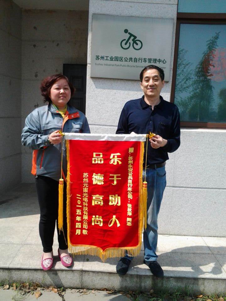 2015年4月23(周四)日中午,蘇州公共自行車經(jīng)理助理張女士檢查公共自行車站點(diǎn)時(shí),撿到兩個(gè)文件袋,她在當(dāng)?shù)氐攘撕芫?,無人認(rèn)領(lǐng)。方打開文件袋檢查兩個(gè)文件袋,發(fā)現(xiàn)文件袋內(nèi)裝有寶馬、本田的機(jī)動(dòng)車登記證書、車輛購置稅證明(正本)、保單各一份,從保單上查找到失主的單位。張經(jīng)理隨即打電話給客服人員,通過百度查詢失主的單位電話號碼與失主同事取得聯(lián)系并交還給失主同事。此時(shí),失主并無察覺到物品遺失。