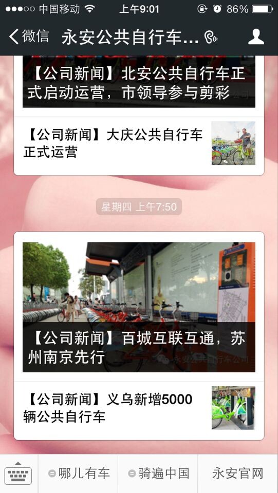 為了更方便市民借還公共自行車,現(xiàn)總公司推出了通過手機微信快捷查詢公共自行車的借還狀況。微信號:ibike668 微信名:永安公共自行車公司,手機掃二維碼也可加入。加入永安公共自行車微信之后,微信下方會顯示“哪兒有車”,周邊站點、地圖都能顯示,市民可以根據(jù)自身要求查詢所需要的信息。如下圖: